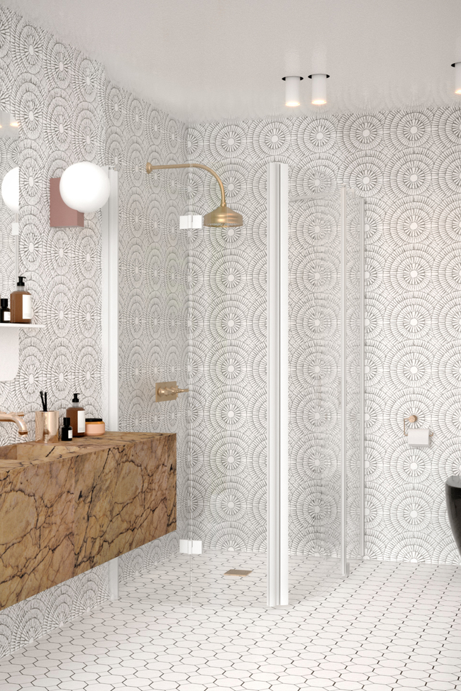 Den fasta väggen och den vikbara dörren fästs från sidorna vid väggarna med profiler för väggfäste. Den fasta väggen stadgas med ett snedstöd, som monteras från överkanten ned till hörnet, samt med ett beslag, som limmas vid underkanten mot golvet. Det blir en 25 mm hög spalt mellan den fasta väggens glas och golvet. Mellan glaset och golvet kan en tätningssockel monteras (standard), då vattnet inte kan ta sig under glaset. På dörrglasens underkanter kan monteras släptätningar (standard), som begränsar vattenflödet. Installations instruktioner