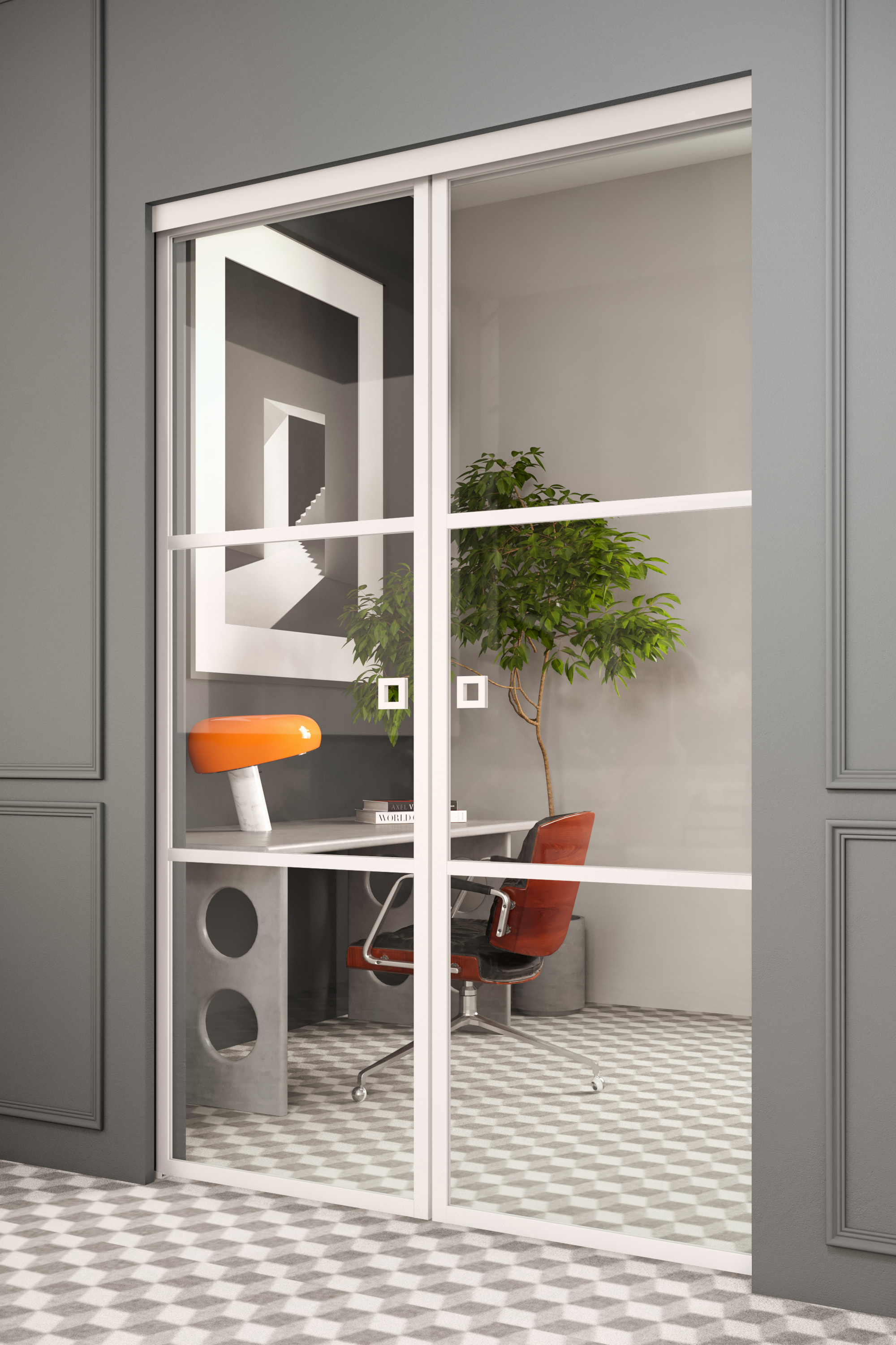 Produkten består av två glasskjutdörrar samt skjutskenor och uppehållsskenor som monteras i öppningens övre kant i taket. Dörrarna glider in i väggen längs skenorna i taket, som fortsätter inuti väggen på bägge sidor. Dörrarna förses med skjutmekanismer av hög kvalitet, samt små styrningsbeslag som limmas i golvet, med hjälp av dessa är dörrarnas rörelse jämn och säker. Dörrarna förses även med en Soft Closing-dämpare var som mildrar stängningen samt försiktigt drar dörrarna till sin stängda position.