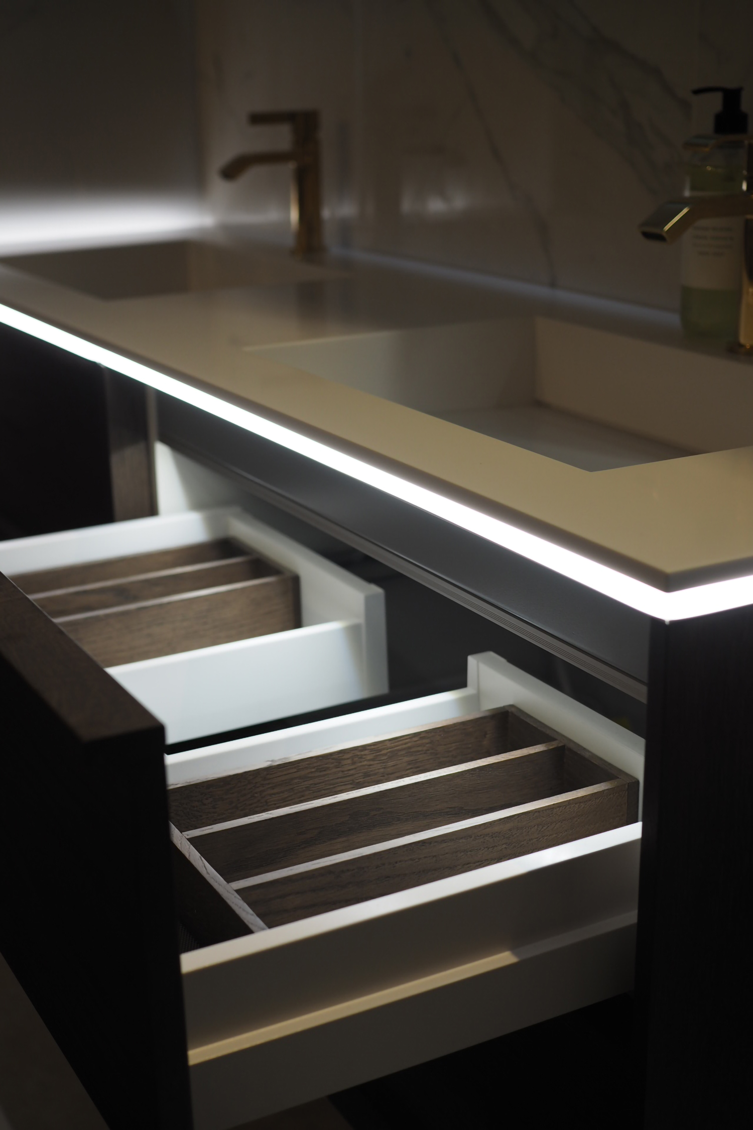 Lighting under the basin/worktop is provided with a motion detector switch. Drawer lighting switches on and off when opening/closing the drawer. Please note that electrical supplementaries require power supply to the cabinet. Electrical supplementaries are IP44 protected. Color temperate of lighting elements is 4000 Kelvins. Standard cabinet is supplied with a siphon which has a plastic, chrome plated bottom plug. Plastic plug can be replaced with a ceramic alternative.