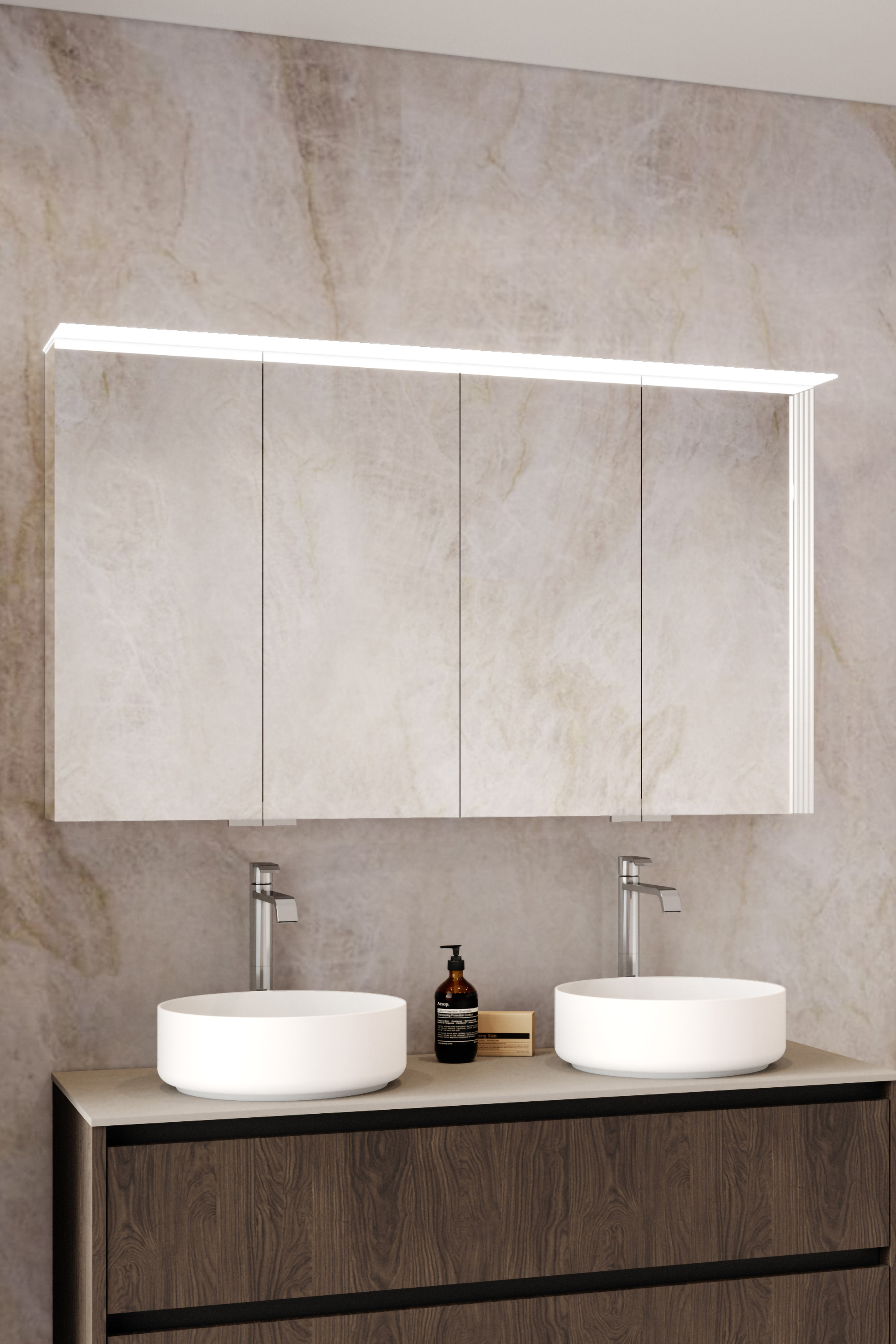 Mirror cabinet is installed on building wall with screws. Installation height can be freely chosen. Mirror cabinet electrical parts are IP44 compliant.