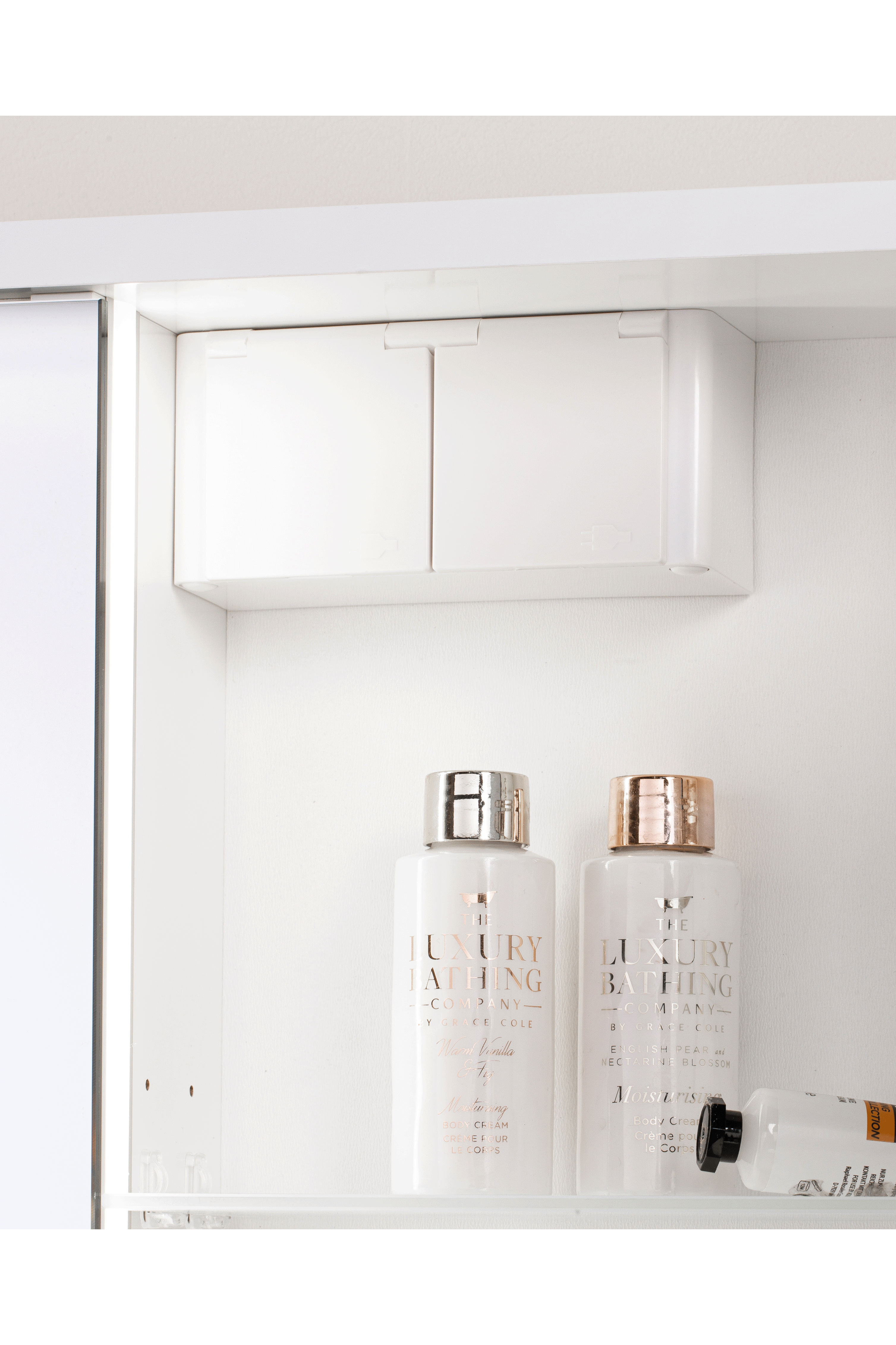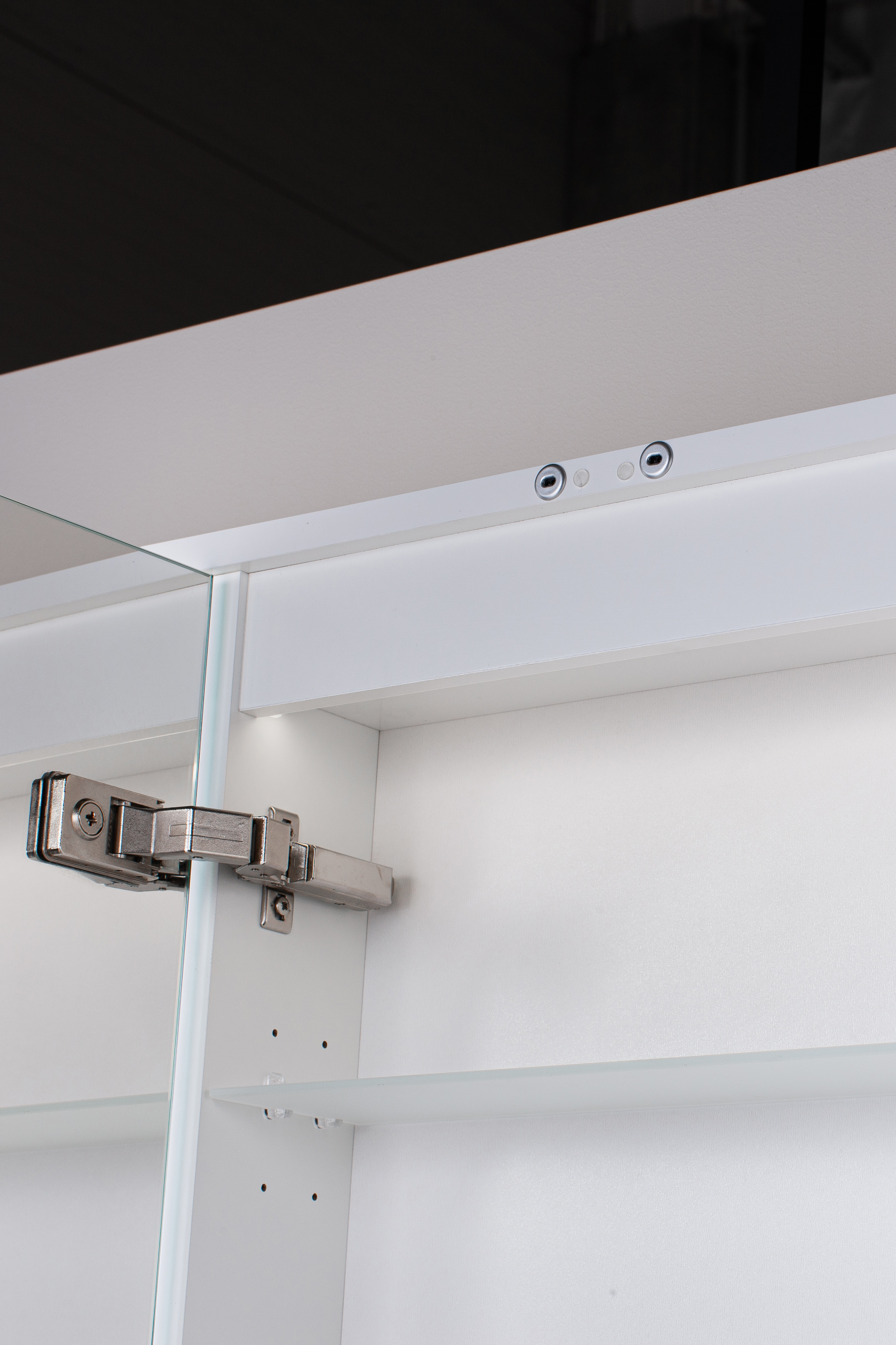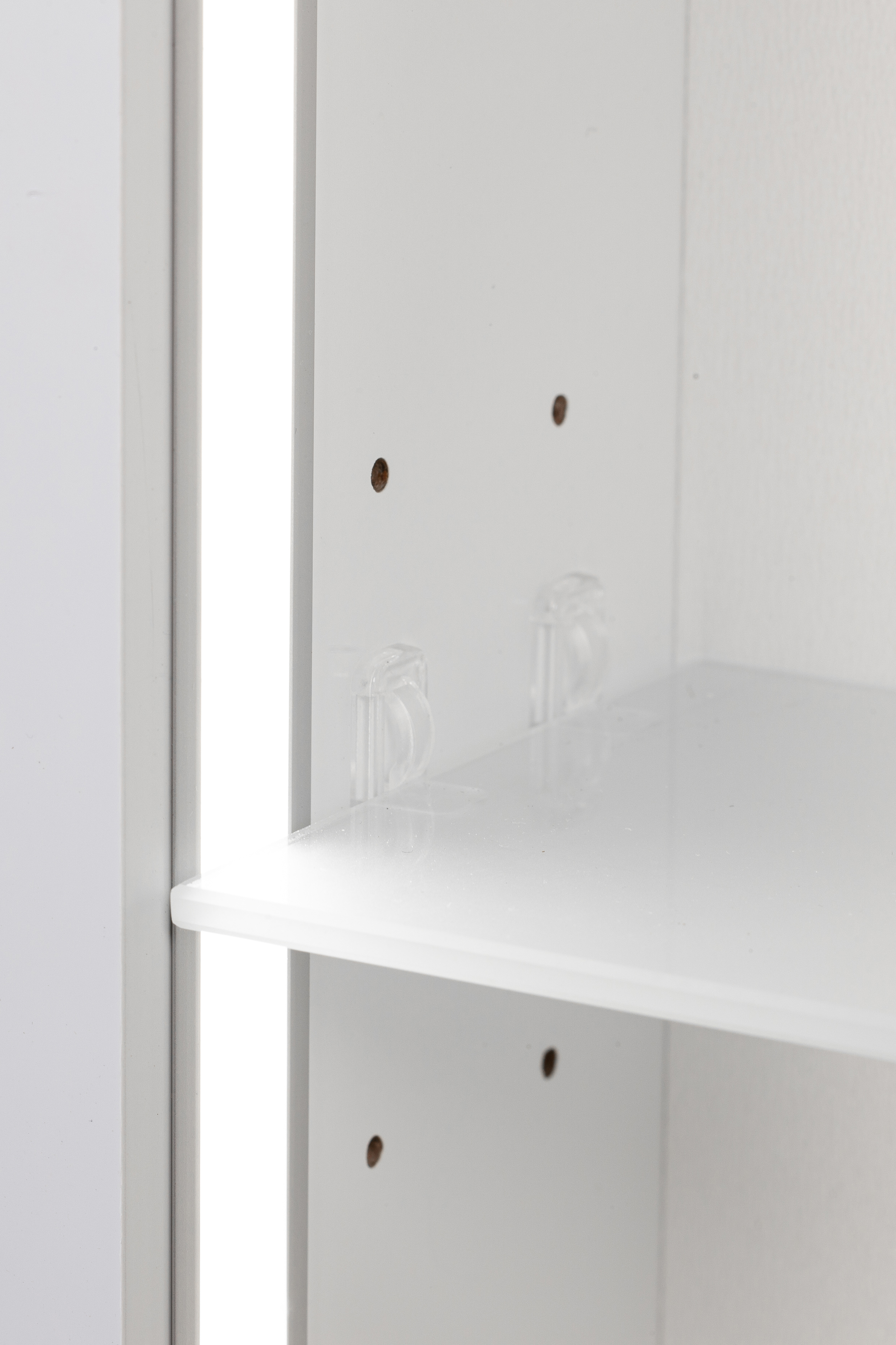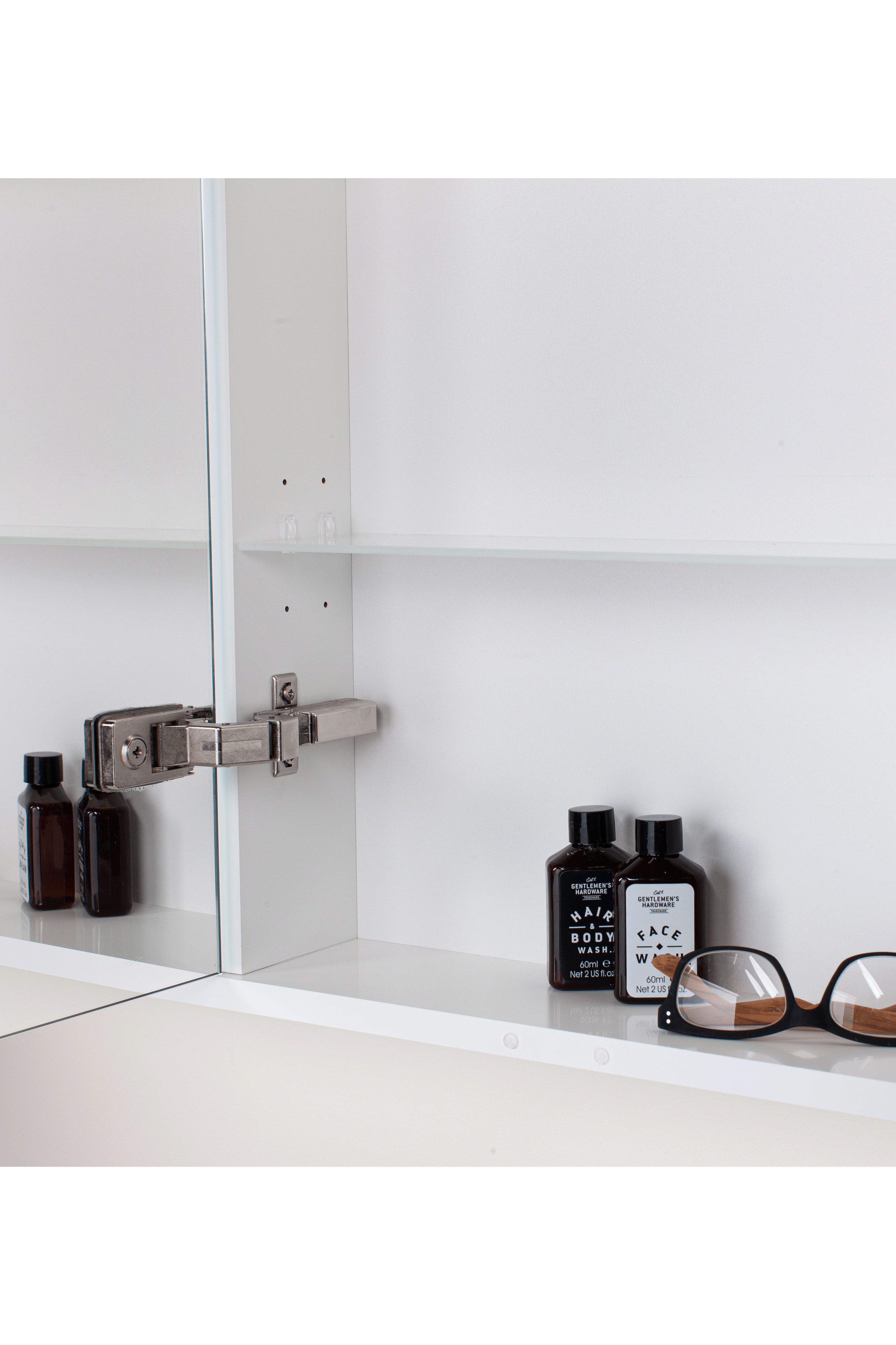Mirror cabinet is provided with LED bottom light. Inside the cabinet there is a diffused lighting system which allows shadowless use of a mirror placed inside the cabinet. There is an electric outlet, electrical switch and glass shelves inside the cabinet.