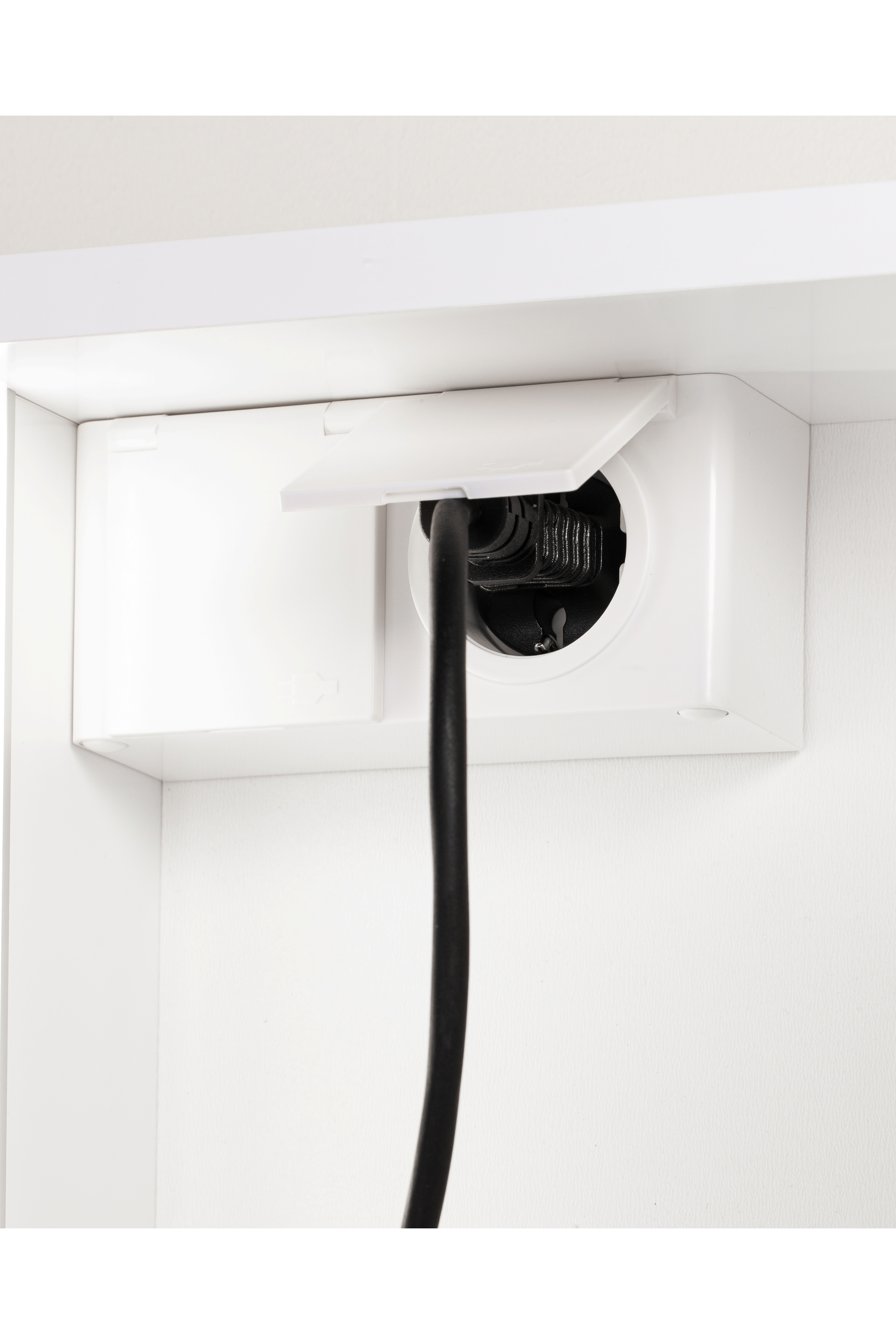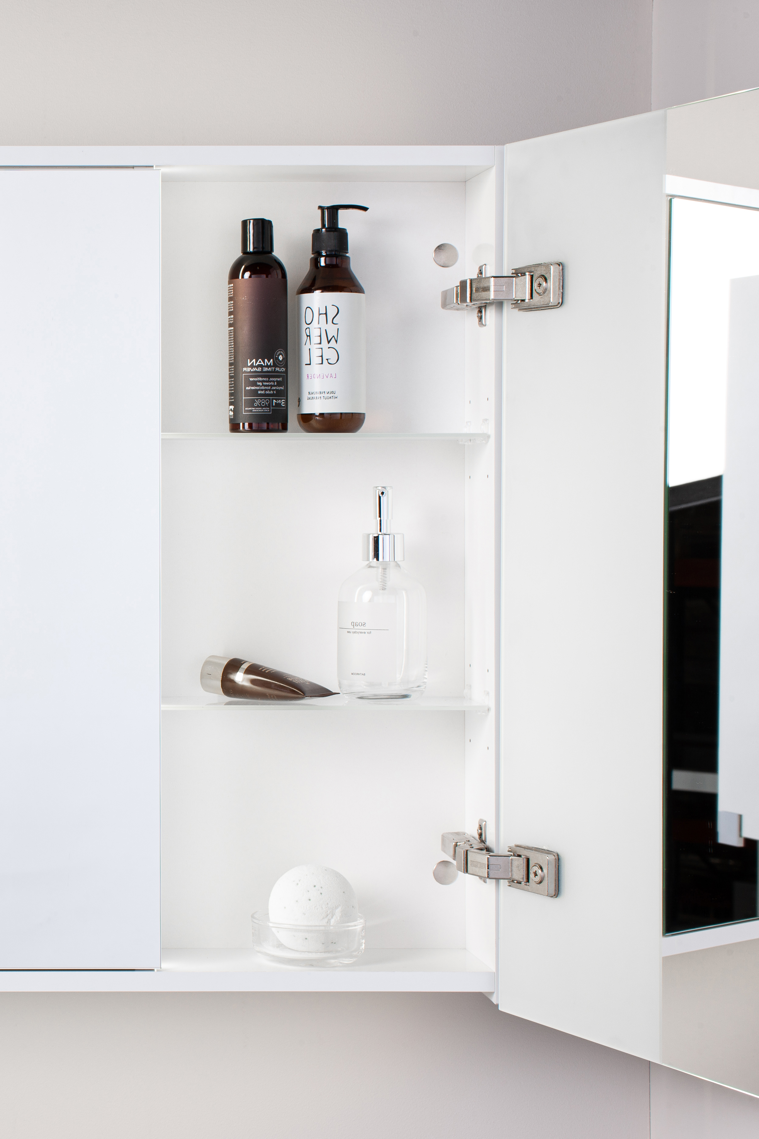 Mirror cabinet is installed on building wall with screws. Installation height can be freely chosen. Mirror cabinet electrical parts are IP44 compliant.