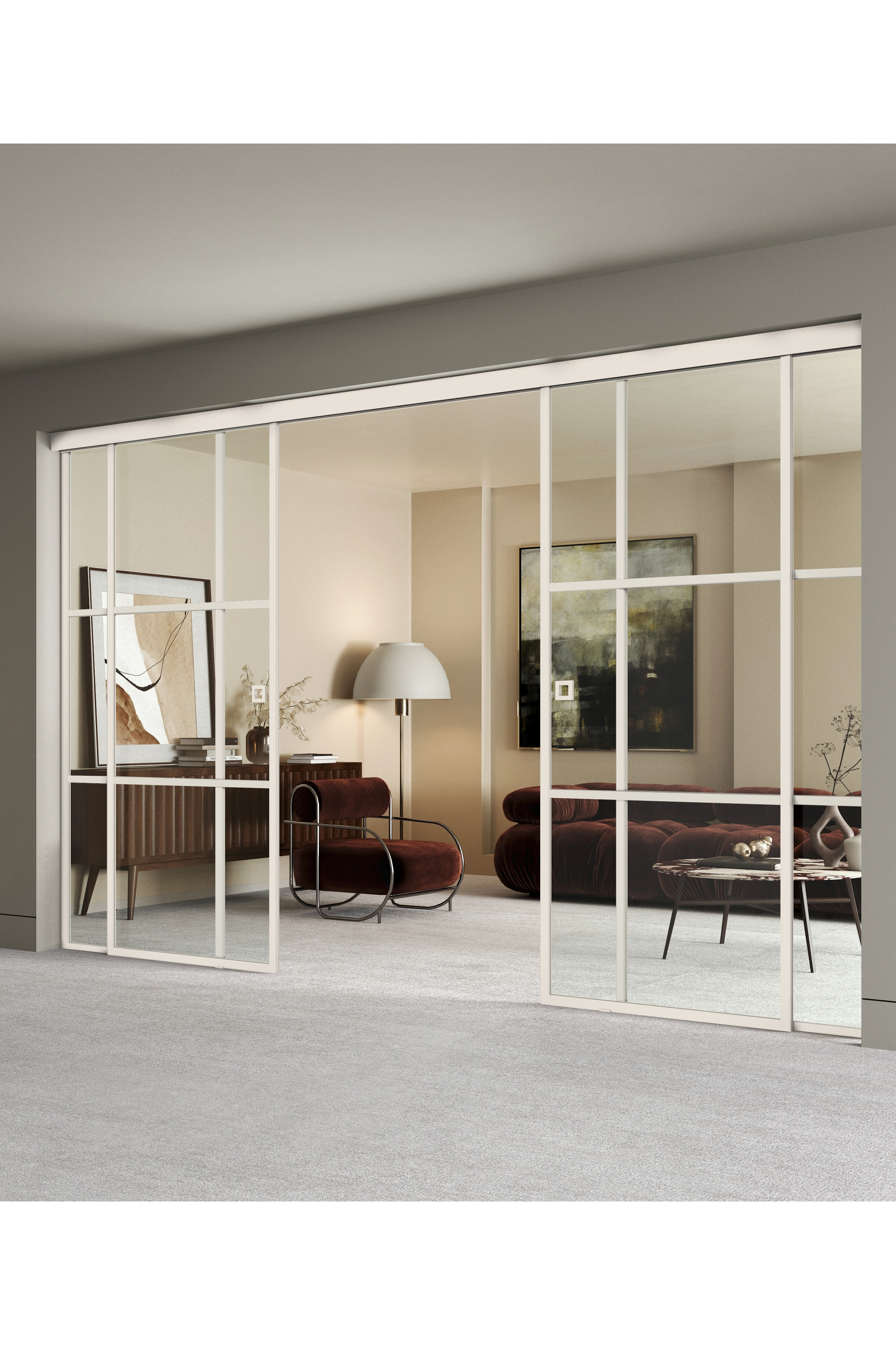 Parskjutdörrar med soft closing-mekanism och två fasta paneler