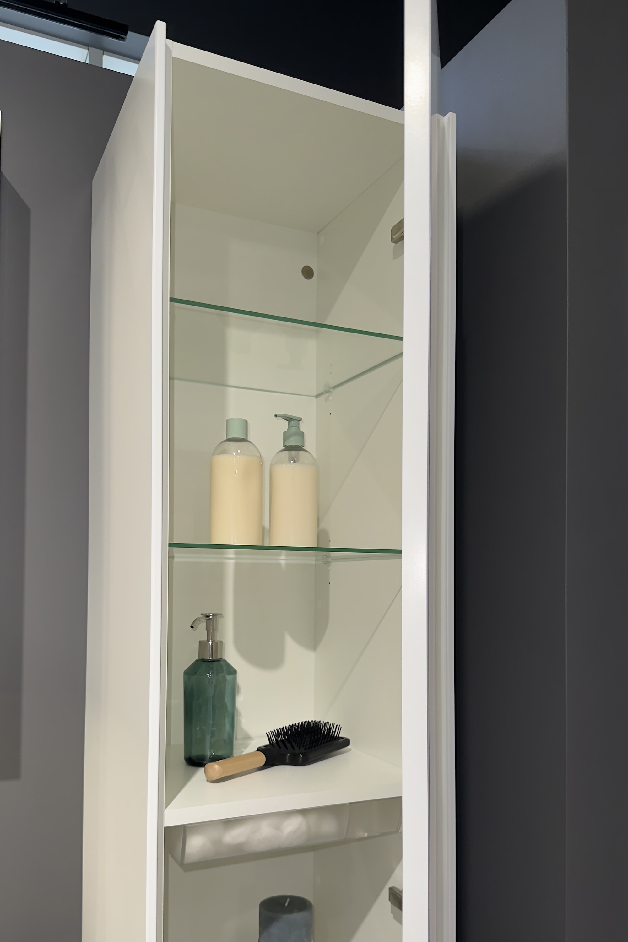 Tall unit bring more storage space to bathroom. Product surface materials are the same as in series vanity units. Tall unit is provided with one door with integrated metal handle. Unit has three adjustable glass shelves.