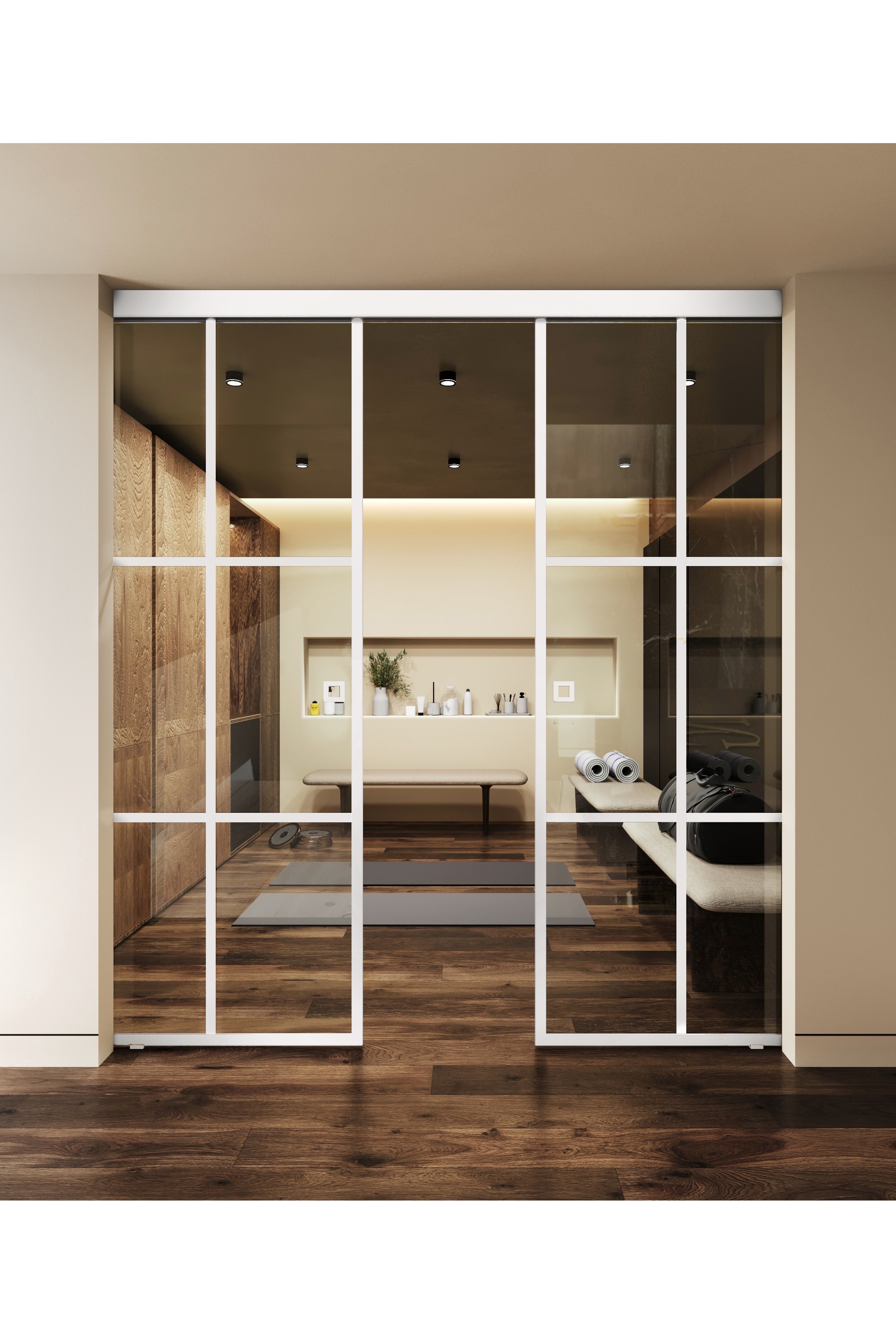 Den dubbla skjutdörren i glas består av två skjutdörrspaneler och en skjutmekanism monterad på byggnadens vägg ovanför dörröppningen. Skjutsdörrsfixeringen tar upp mycket lite utrymme i rummet, en kvalitativ glidmekanism och en golvstyrning ger en jämn och säker rörelse av dörren. Dörrarna är utrustade med mjuk stängningsmekanism som mildrar stängningen och försiktigt drar dörren på plats.